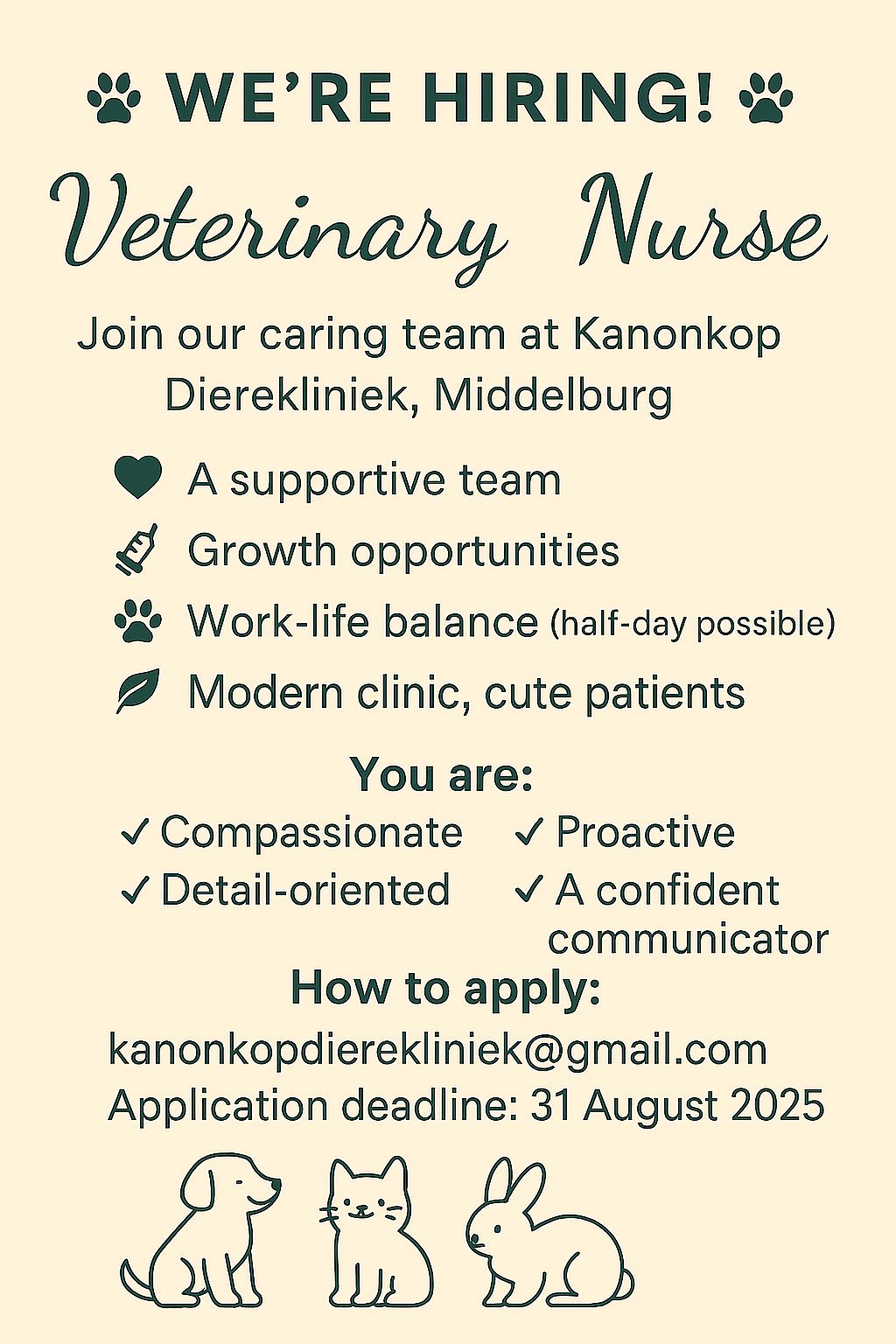 To apply for this job email your details to kanonkopdierekliniek@gmail.com.